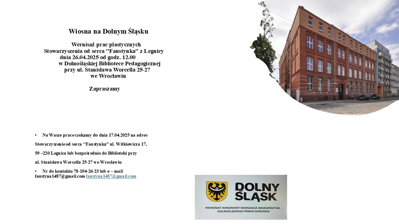Stowarzyszenie od serca „Faustynka” z siedzibą w Legnicy od 11 lat opiera swoją działalność o sferę edukacyjną, kulturalno-społeczną i przybliża świat wartości katolickich poprzez sztukę. Swoje inicjatywy takie jak konkursy plastyczne, wystawy czy wernisaże kieruje do rodzin z całego Dolnego Śląska.