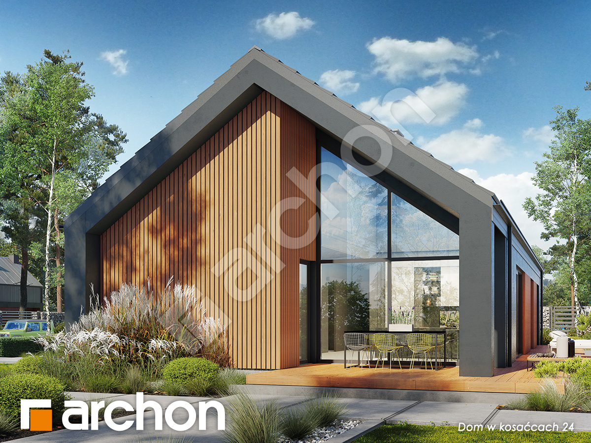 Doskonały wybór dla miłośników prostej, eleganckiej architektury. Kompaktowa bryła z jednostanowiskowym garażem, zwieńczona dwuspadowym dachem bez okapów, zachwyca nowoczesną formą i przytulnym charakterem. Antracytowe tynki w zestawieniu z drewnianą okładziną nadają elewacji wyrazistości i subtelnie wkomponowują budynek w naturalne otoczenie.