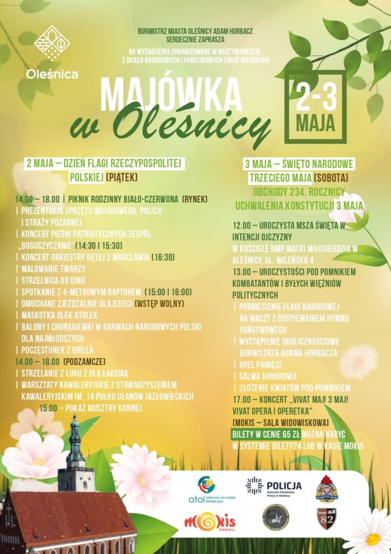 Burmistrz Miasta Oleśnicy Adam Horbacz serdecznie zaprasza na wydarzenia organizowane w Oleśnicy z okazji narodowych i państwowych świąt majowych.