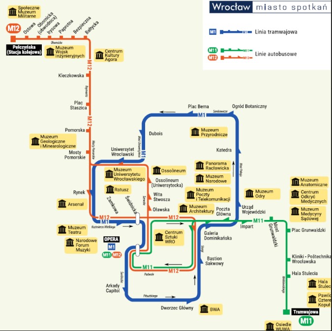 W centrum do instytucji dowiozą uczestników zabytkowe tramwajowe (Linke-Hofmann Standard z 1029 roku i Konstale), a do instytucji położonych dalej kultowe Ikarusy i Jelcze. CH Zajezdnia zorganizuje dodatkowo transport pomiędzy swoimi placówkami (CH Zajezdnia- Dom Edyty Stein- Wystawa Golgota Wschodu) kultowym „ogórkiem”. Linie będą kursować w godzinach 16:00-23:00. Centrum przesiadkowym będzie pl. Teatralny (Opera), gdzie wszystkie linie będą się zbiegać i skąd zabytkowe pojazdy komunikacji miejskiej będą łącznie odjeżdżać. Wszystkie rozkłady będą zamieszczone będą na stronie kstm.pl i wroclaw.pl. Operatorem linii jest Klub Sympatyków Transportu Miejskiego.