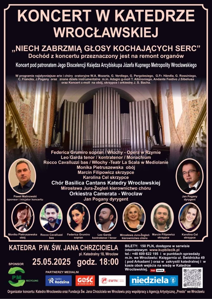 W najnowszym wydaniu audycji „Dziś w Kościele” ks. Paweł Cembrowicz, proboszcz Wrocławskiej Katedry zaprosił słuchaczy na wyjątkowe wydarzenie artystyczne – uroczysty koncert „Niech zabrzmią głosy kochających serc”, który odbędzie się 25 maja o godz. 18:00 w Katedrze św. Jana Chrzciciela we Wrocławiu. Dochód z koncertu zostanie w całości przeznaczony na remont Wielkich Organów – jednego z najcenniejszych instrumentów w Polsce.