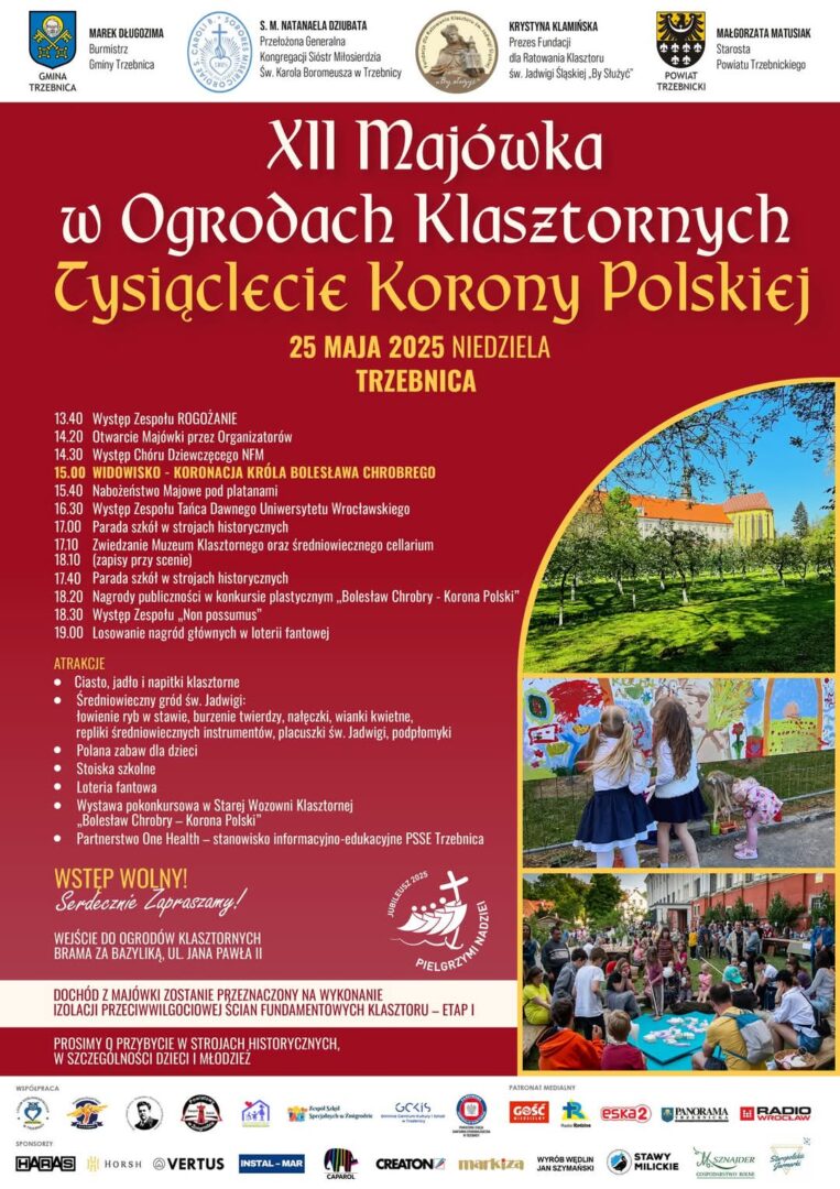 Starostwo Powiatu Trzebnickiego, Gmina Trzebnica, Siostry Boromeuszki i Fundacja dla Ratowania Klasztoru św. Jadwigi Śląskiej „By Służyć” zapraszają radiosłuchaczy i wiernych Archidiecezji Wrocławskiej do wspólnego świętowania majówki. Tegoroczna edycja dedykowana jest Tysiącleciu Korony Polskiej.