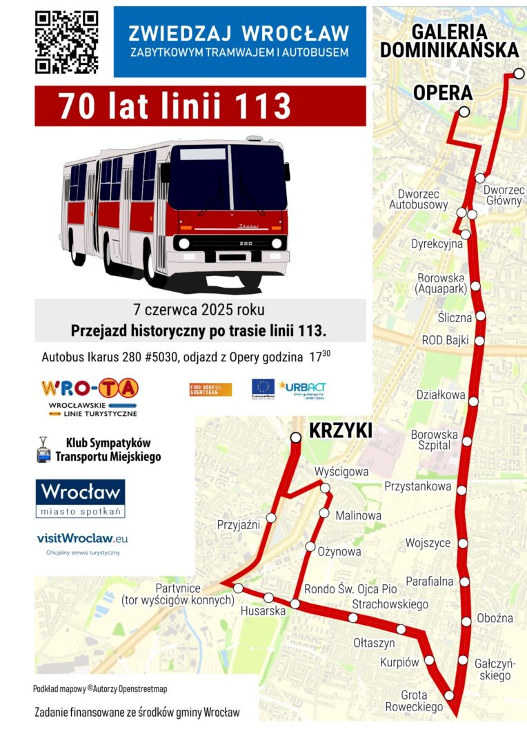 Dodatkowo w najbliższą sobotę 7 czerwca Klub Sympatyków Transportu Miejskiego zaprasza na kolejny przejazd śladami linii, które po raz pierwszy uruchomiono w 1955 r. Na początku poprzedniego miesiąca odbył się kurs śladem linii 103, a tym razem udamy się śladami linii 113. Kurs odbędzie się po ostatnim przejeździe linii turystycznej B, czyli autobus wyruszy z Opery na Krzyki około godz. 17.30.