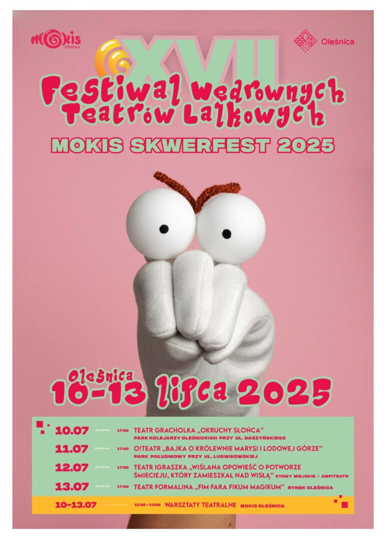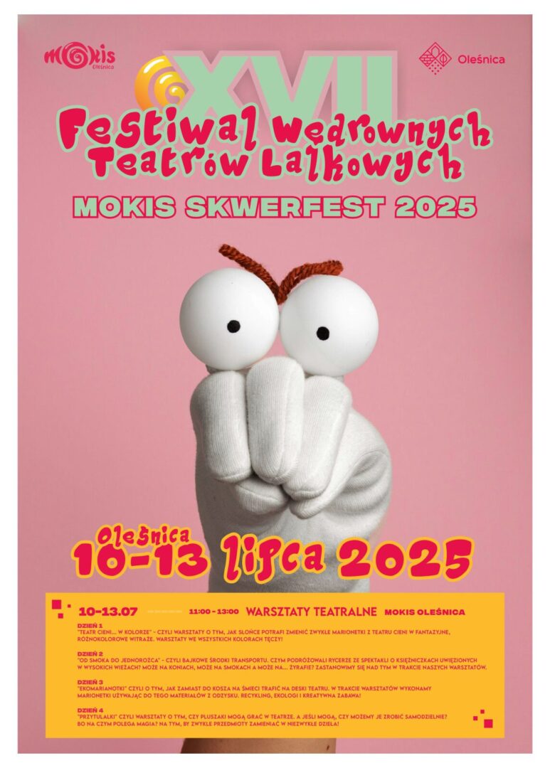 Miejski Ośrodek Kultury i Sztuki w Oleśnicy serdecznie zaprasza do udziału w XVII Festiwalu Wędrownych Teatrów Lalkowych MOKiS SKWERFEST, który w tym roku odbędzie się w dniach 10-13 lipca 2025. Wydarzenie odbędzie się w różnych przestrzeniach miejskich w Oleśnicy, gdzie każdy będzie mógł doświadczyć magii teatrów lalkowych.