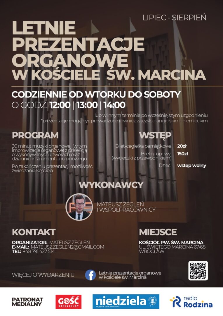 Już od początku lipca we Wrocławiu rusza cykl wydarzeń – Letnie Prezentacje Organowe w kościele św. Marcina. To inicjatywa, która łączy muzykę organową, edukację i chęć ożywienia jednego z najstarszych kościołów w mieście. Pomysłodawcą i organizatorem wydarzenia jest Mateusz Żegleń, nauczyciel w Metropolitalnym Studium Organistowskim we Wrocławiu.
