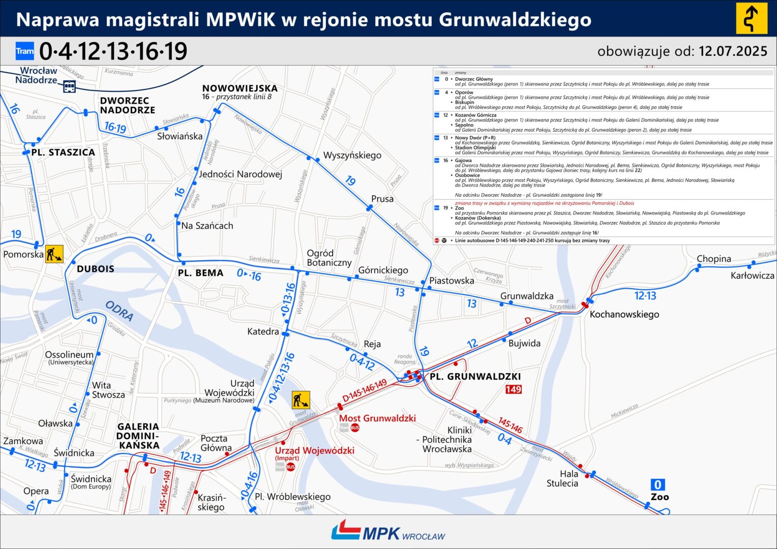 Miejskie Przedsiębiorstwo Wodociągów i Kanalizacji we Wrocławiu informuje o terminie rozpoczęcia naprawy magistrali wodociągowej, zlokalizowanej przy moście Grunwaldzkim. Roboty ziemne rozpoczną się w weekend 12-13 lipca 2025 roku i spowodują utrudnienia w ruchu drogowym oraz tramwajowym, jednak przeprawa pozostanie przejezdna dla samochodów i autobusów.