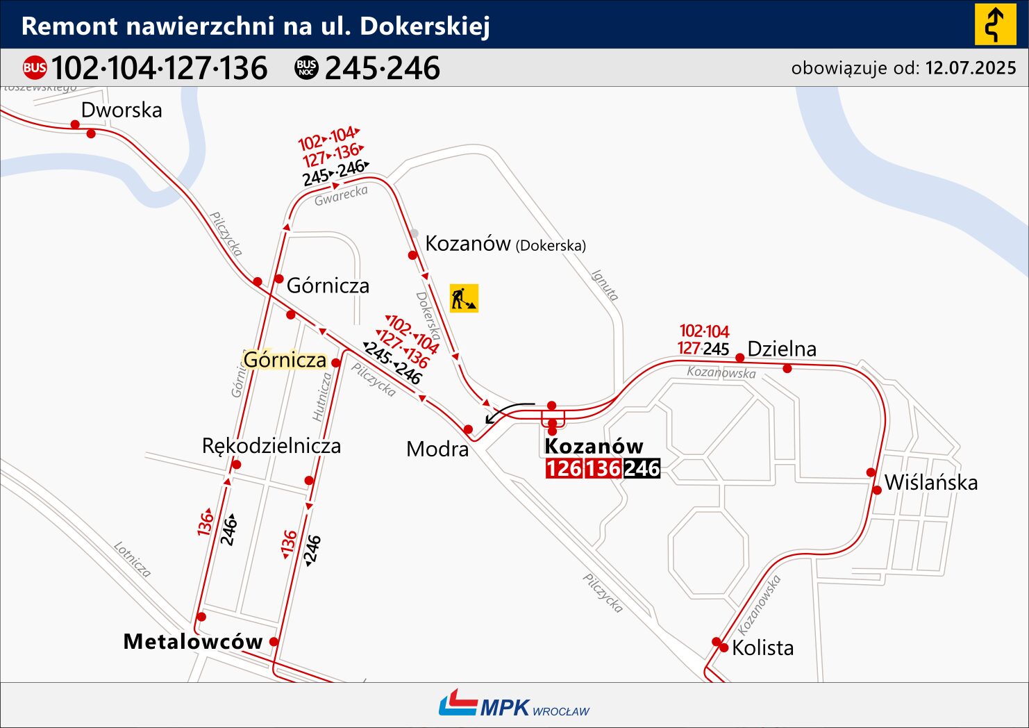 Autobusy linii 102>Pilczyce, 104>Rędzińska, 127>Kozia, 136>Tarnogaj oraz autobusy linii nocnych 245>Pracze Odrzańskie, 246>Sołtysowice zostaną skierowane od pętli Kozanów (136, 246)/ ul. Pilczyckiej (102, 104, 127, 245) przez ul. Kozanowską, Pilczycką.