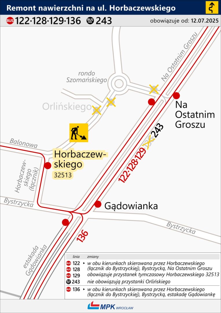 Autobusy linii 122, 128, 129 oraz autobusy linii nocnej 243 zostaną skierowane w obu kierunkach od ul. Legnickiej przez ul. Na Ostatnim Groszu, Bystrzycką, Horbaczewskiego.