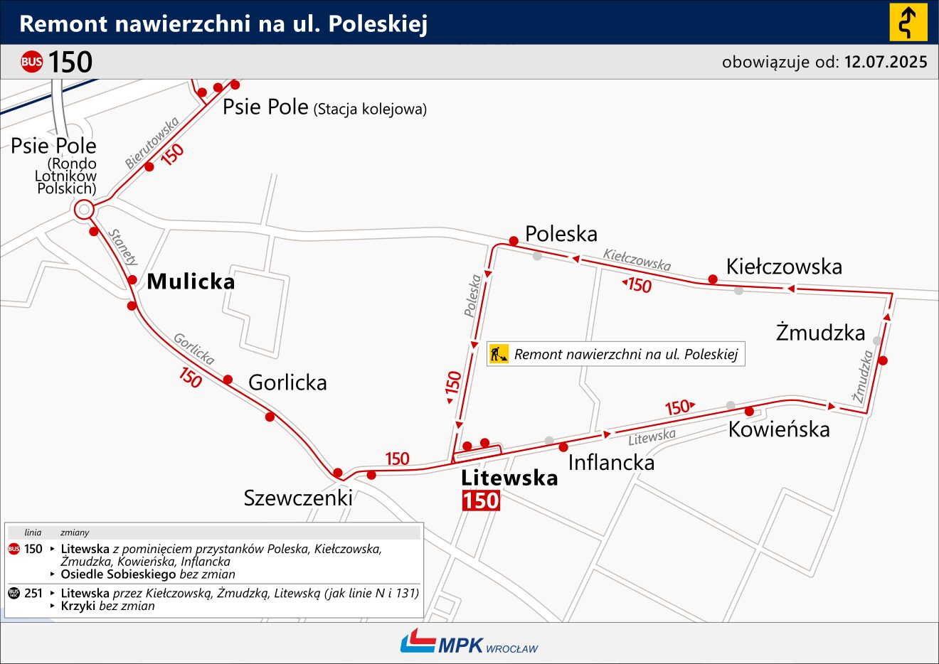 Autobusy linii 150 jadące w kierunku pętli Litewska zostaną skierowane od ul. Gorlickiej przez ul. Litewską. Z pominięciem przystanków „Poleska”, „Kiełczowska”, „Żmudzka”, „Kowieńska”, „Inflancka”.