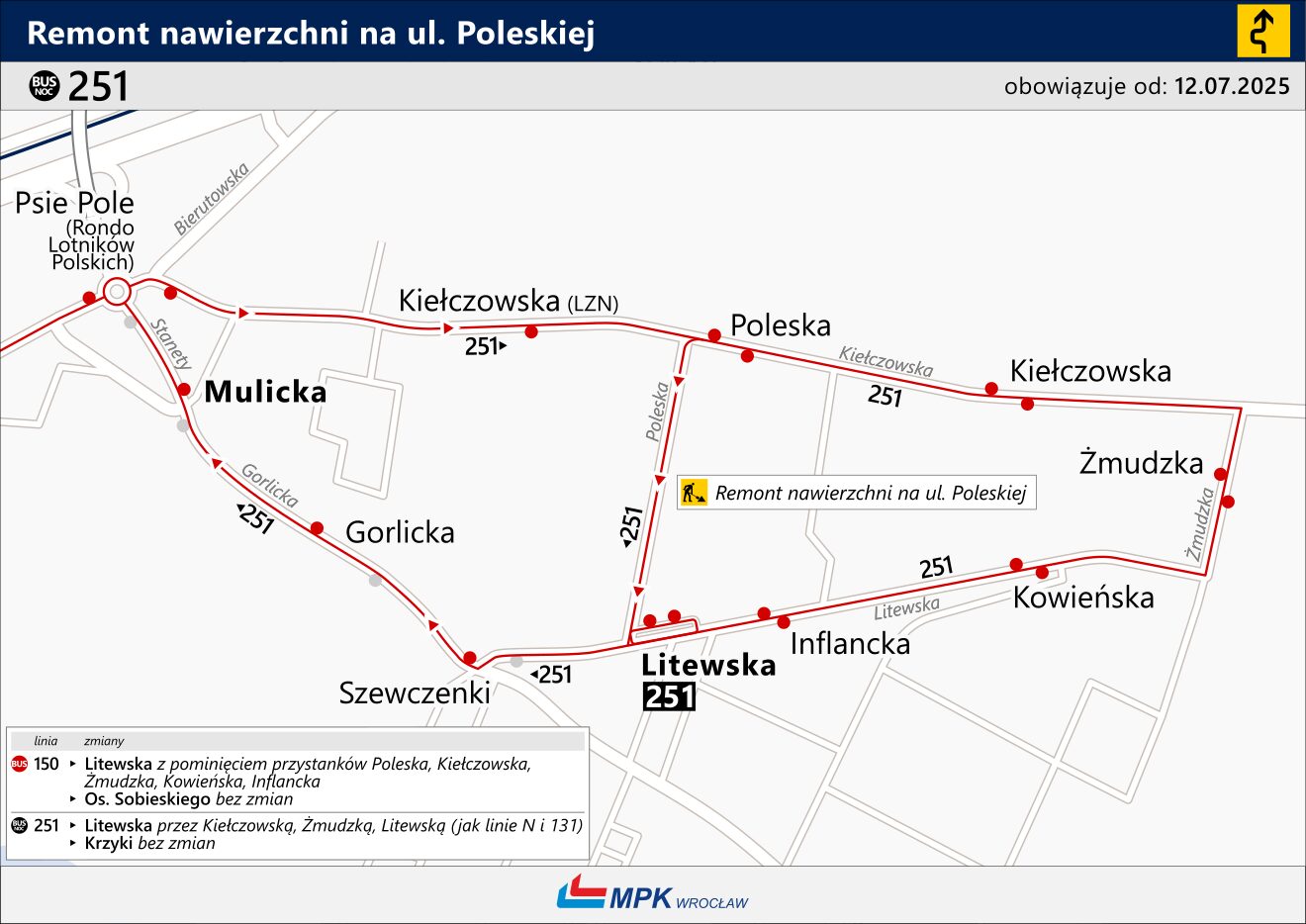 Autobusy linii nocnej 251 jadące w kierunku pętli Litewska zostaną skierowane przez ulice Kiełczowską, Żmudzką i Litewską (po trasie linii N i 131). Ominą przystanki na ul. Stanety i Gorlickiej oraz przystanek „Szewczenki”.