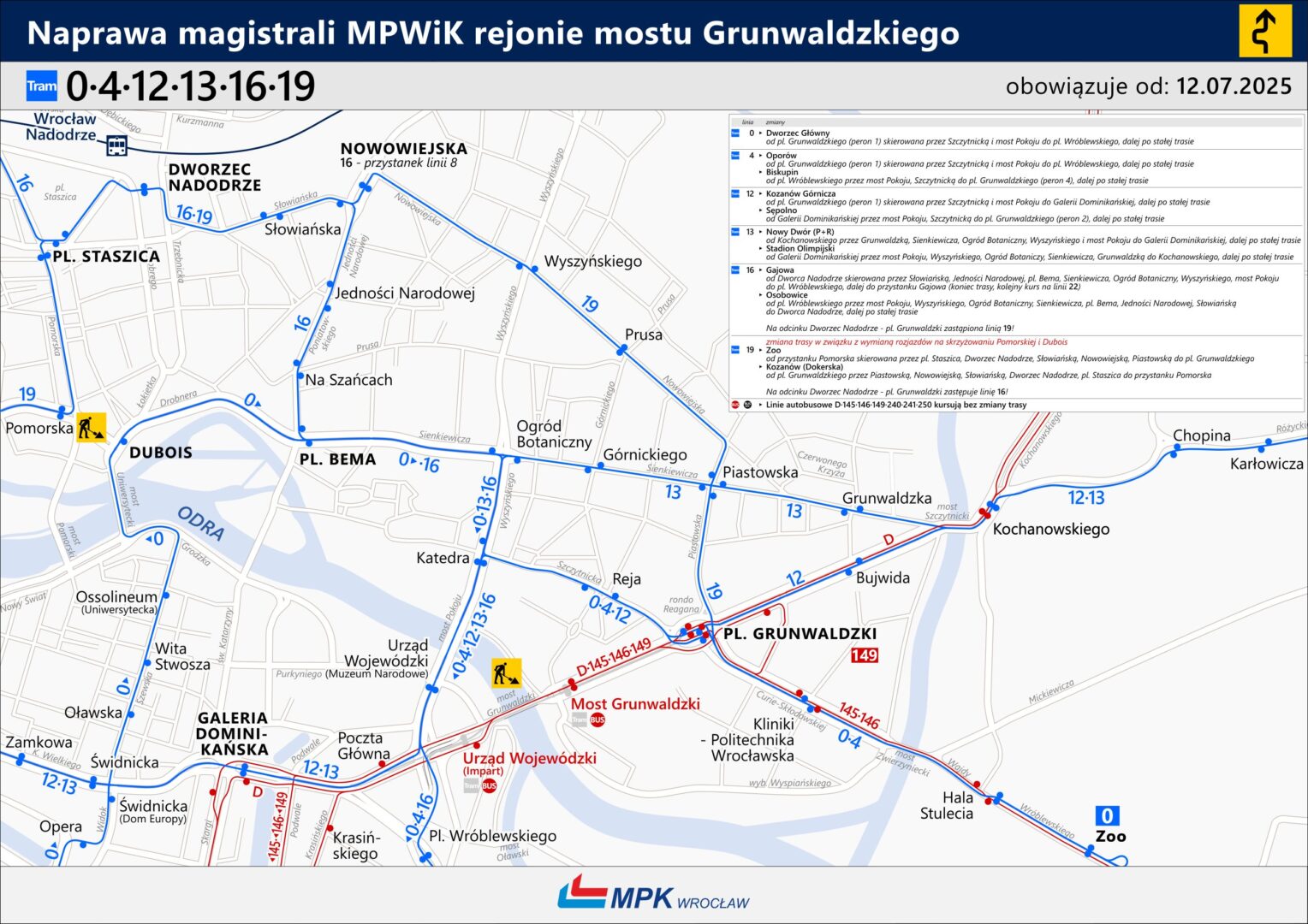 W związku z koniecznością usunięcia awarii wodociągowej przed wjazdem na most Grunwaldzki od strony placu Społecznego oraz zakończeniem remontu torowiska na skrzyżowaniu Oławskiej i Podwala, od wyjazdów porannych 12 lipca 2025 roku zostanie wprowadzona następująca zmiana w organizacji komunikacji zbiorowej (tramwaje):