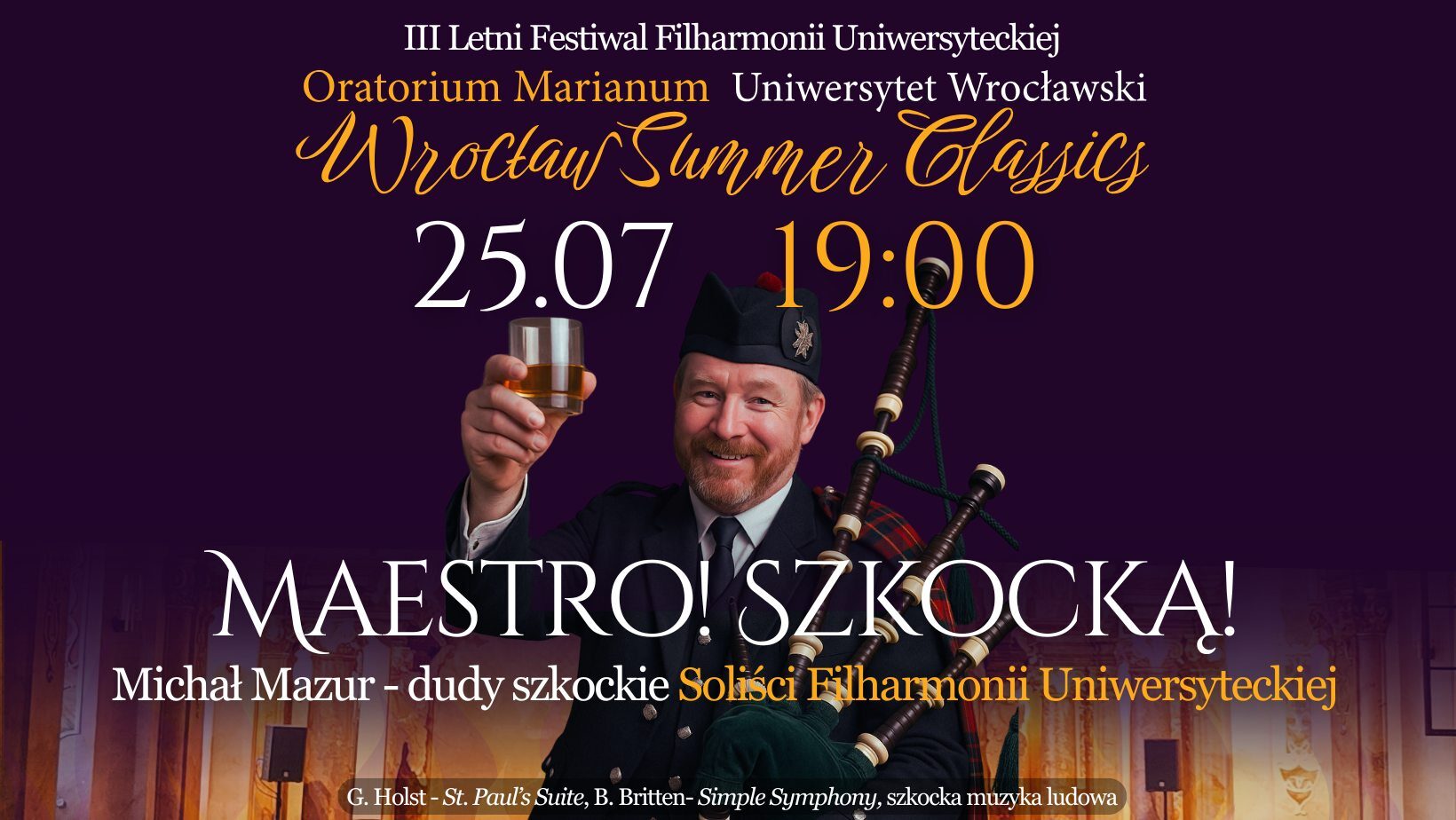 W roli głównej wystąpi Michał Mazur, który przeniesie nas w serce Highlands, wykonując energetyczną i pełną ducha muzykę szkocką na dudach i fletach tradycyjnych. Towarzyszyć mu będzie Zespół Solistów Filharmonii Uniwersyteckiej, prezentując trzy pełne uroku i finezji dzieła brytyjskich kompozytorów: barwną i taneczną St. Paul’s Suite Gustava Holsta, ludową i porywającą suitę Capriol Petera Warlocka oraz pełną młodzieńczego wigoru Simple Symphony Benjamina Brittena.