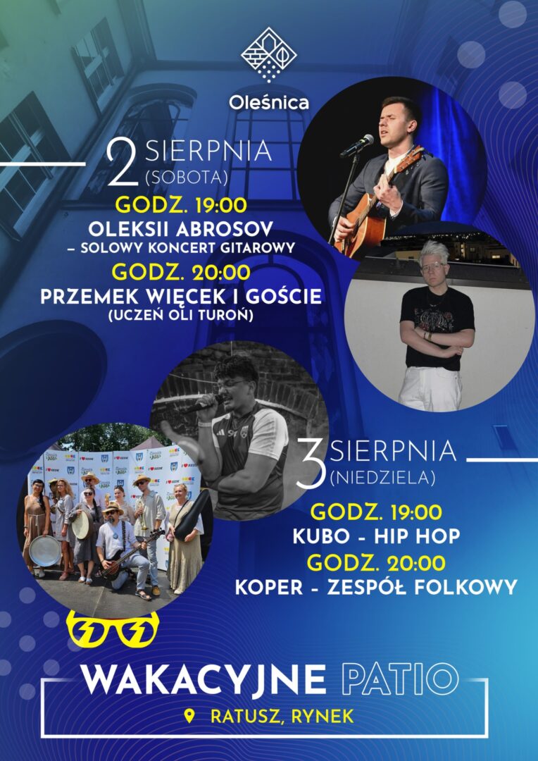 Lato w Oleśnicy zapowiada się muzycznie i klimatycznie. Od początku lipca do końca sierpnia mieszkańcy i turyści będą mogli uczestniczyć w cyklu wydarzeń kulturalnych „Wakacyjne Patio 2025”, odbywających się na Rynku przy Ratuszu. Wstęp wolny.