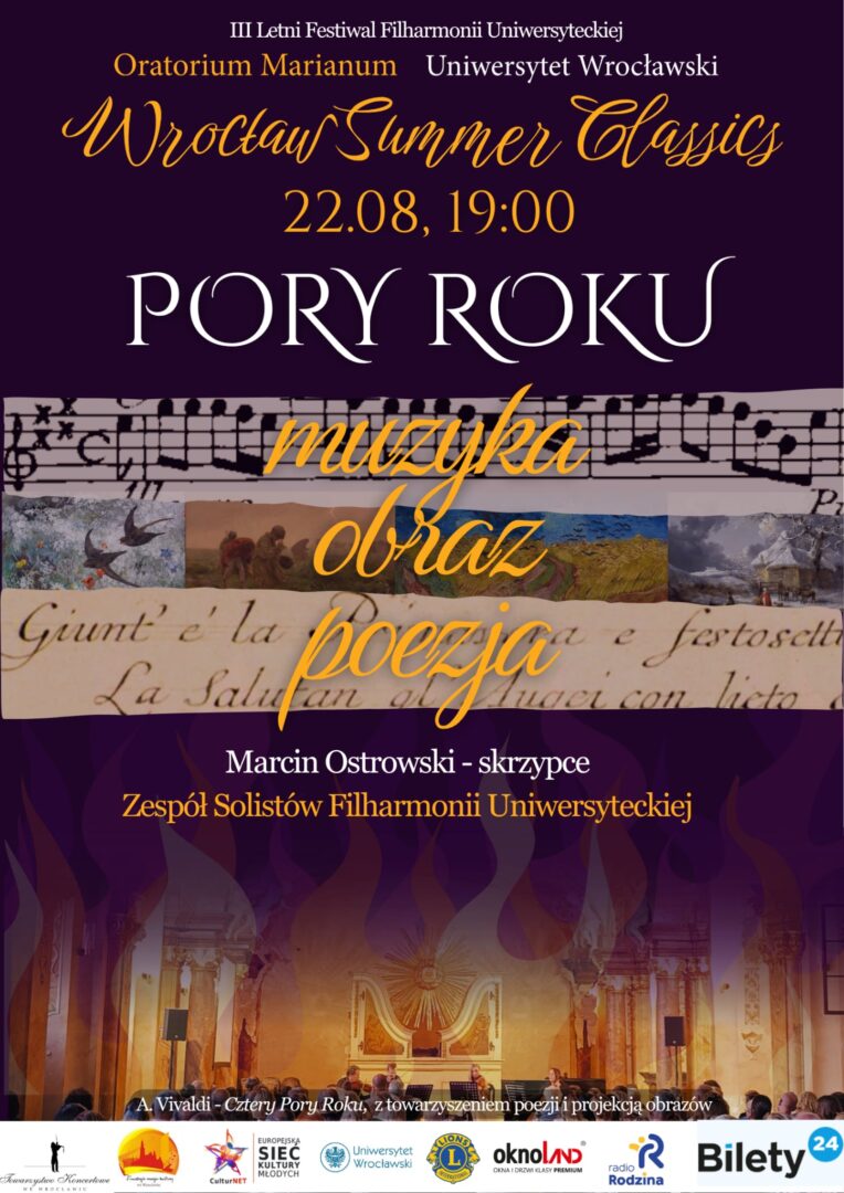 Zapraszamy na niezwykły koncert, podczas którego zabrzmi jedno z najbardziej rozpoznawalnych arcydzieł muzyki barokowej – „Cztery Pory Roku” Antonio Vivaldiego. W roli solisty wystąpi Marcin Ostrowski, który wraz z Zespołem Solistów Filharmonii Uniwersyteckiej poprowadzi słuchaczy przez pełen barw i emocji świat przyrody, uchwycony w muzycznej formie. Wydarzenie zyska szczególny wymiar dzięki multimedialnej oprawie wizualnej – projekcji obrazów inspirowanych tematyką każdej z części cyklu. Ilustracje te będą tworzyć malarską narrację, współgrającą z dźwiękami i podkreślającą zmienność nastrojów zawartych w partyturze. Integralnym elementem koncertu będą również sonety, które Vivaldi dołączył do każdej z pór roku. Ich poetycka treść stanowić będzie pomost między muzyką a wyobraźnią słuchacza. Wieczór ten będzie spotkaniem trzech sztuk: muzyki, obrazu i słowa, splecionych w jedno, poruszające doświadczenie artystyczne.