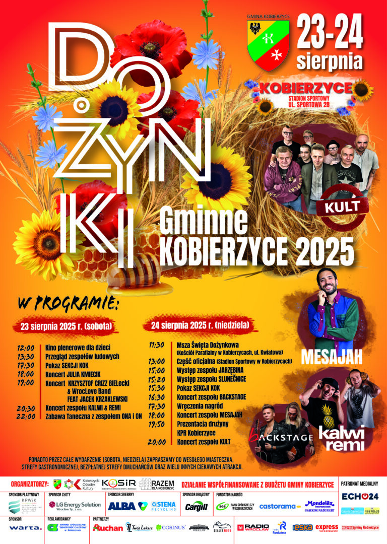 Dożynki Gminne w Kobierzycach mają szczególne znaczenie – to najważniejsze święto gminy. W programie m.in. koncerty zespołów Kult, Mesajah, Kalwi & Remi, strefa atrakcji dla najmłodszych, dmuchańce, animacje, snowtubing czy lokalne produkty. Wydarzenie odbędzie się w dniach 23-24 sierpnia 2025 roku.