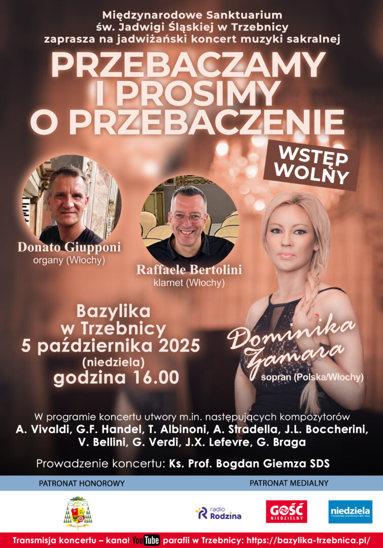 Koncert pt. „Przebaczamy i prosimy o przebaczenie” odbędzie się 5 października o godz. 19:00 w Międzynarodowym Sanktuarium św. Jadwigi Śląskiej w Trzebnicy. Wstęp jest wolny.