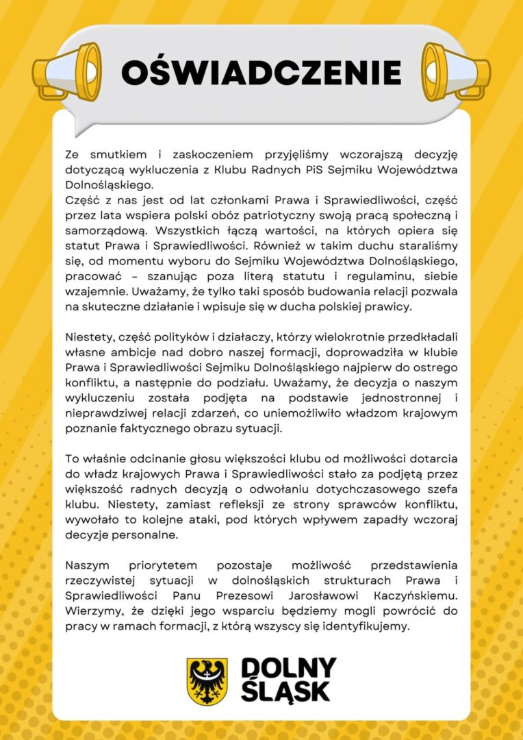 „Ze smutkiem i zaskoczeniem przyjęliśmy wczorajszą decyzję dotyczącą wykluczenia z Klubu Radnych PiS Sejmiku Województwa Dolnośląskiego” – napisali politycy. Przypomnieli, że część z nich od lat działa w strukturach partii, a wszyscy konsekwentnie wspierali „polski obóz patriotyczny” swoją pracą społeczną i samorządową.