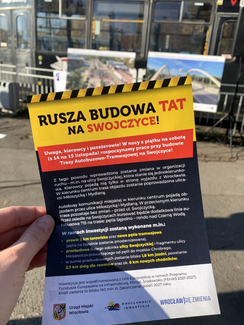 Wkrótce rozpocznie się budowa trasy Tramwajowo-Autobusowej (TAT) na Swojczyce. W nocy z piątku na sobotę 14/15 listopada wprowadzona zostanie zmiana w organizacji ruchu. Najważniejsza z nich dotyczy ulicy Swojczyckiej, na której ruch będzie odbywał się wyłącznie w jednym kierunku. W stronę centrum zostaną wprowadzone objazdy.