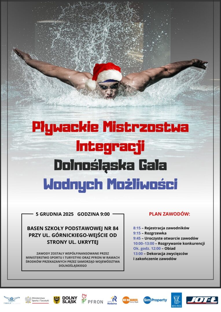 Już 5 grudnia 2025 roku na basenie Szkoły Podstawowej nr 84 we Wrocławiu (wejście od ul. Ukrytej) odbędą się Pływackie Mistrzostwa Integracji – Dolnośląska Gala Wodnych Możliwości (III Dolnośląskie Mikołajkowe Zawody Pływackie) – wydarzenie, które łączy sportową rywalizację z integracją i dobrą zabawą.