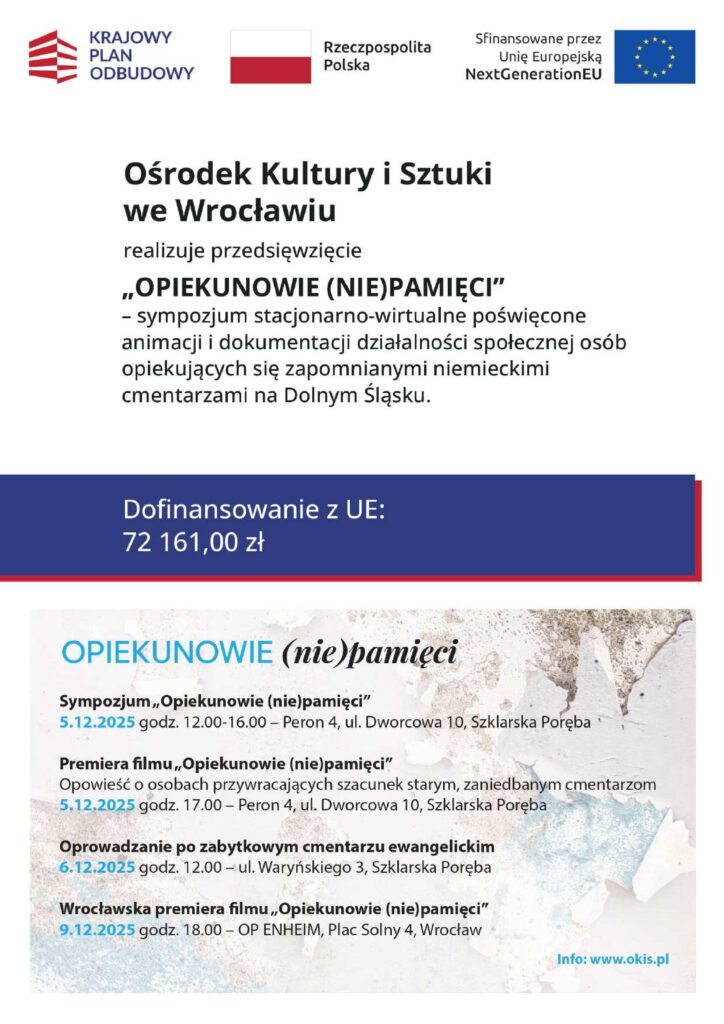 Pokaz premierowy filmu pt. „Opiekunowie (nie)pamięci” odbędzie się 5 grudnia o 17:00 w przestrzeni Dworca Szklarska Poręba Górna. Wrocławska premiera zaplanowana jest na 9 grudnia o 18:00 w kamienicy OP ENHEIM, wstęp wolny.