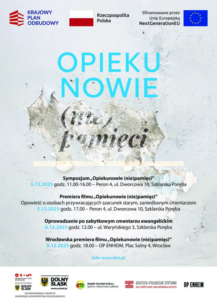 Ośrodek Kultury i Sztuki (OKIS) zaprasza na premierę filmu pt. „Opiekunowie (nie)pamięci”, która odbędzie się 5 grudnia w Szklarskiej Porębie, a w przyszłym tygodniu we Wrocławiu. To historia społeczników-pasjonatów, którzy podjęli się ochrony starych dolnośląskich cmentarzy od zapomnienia. Wydarzeniu towarzyszyć będzie sympozjum z udziałem ekspertów z Polski i Niemiec.