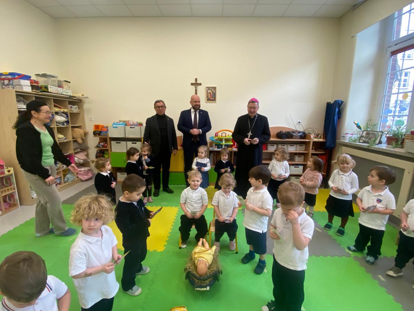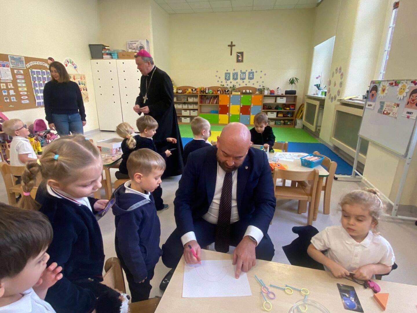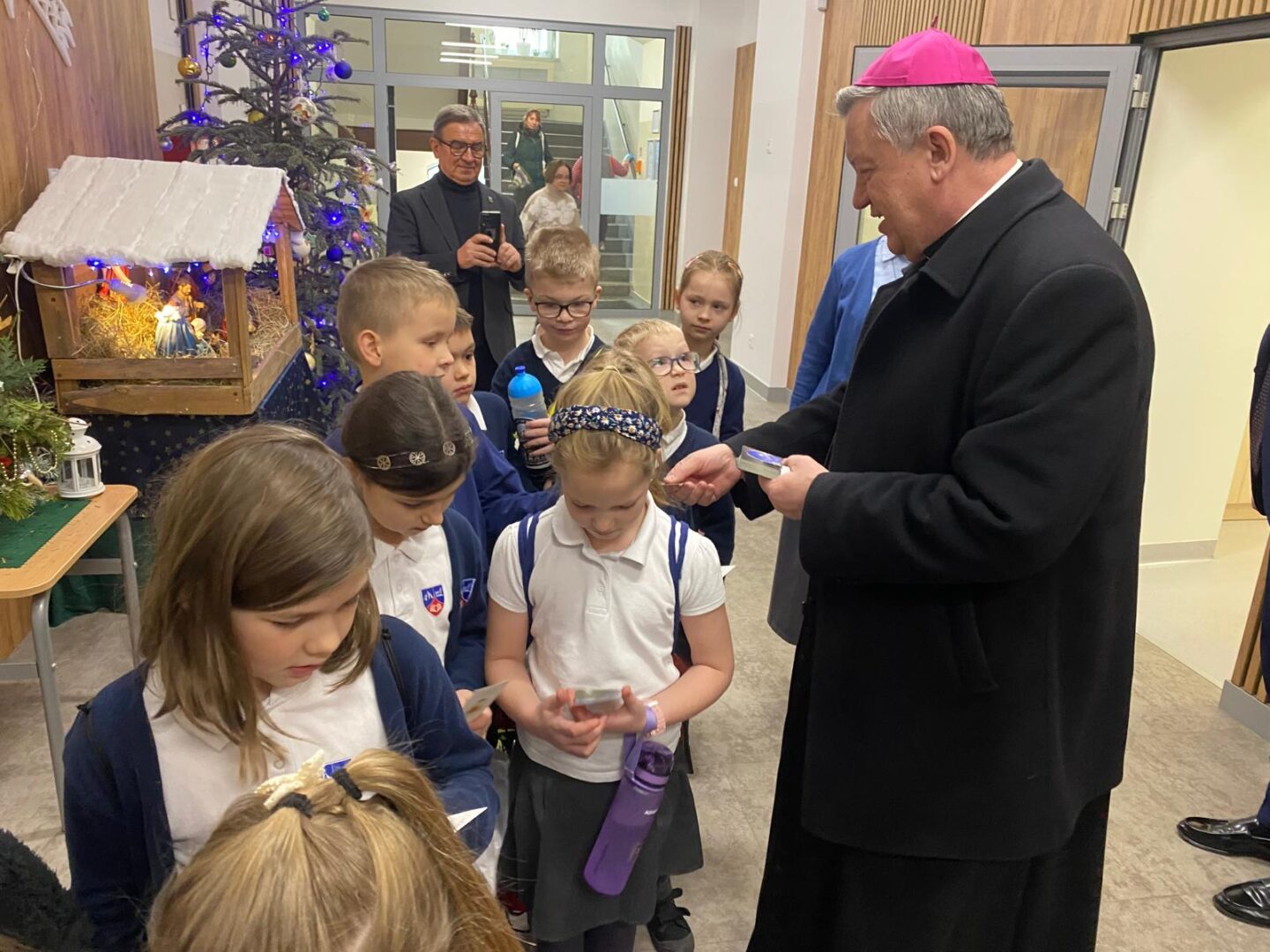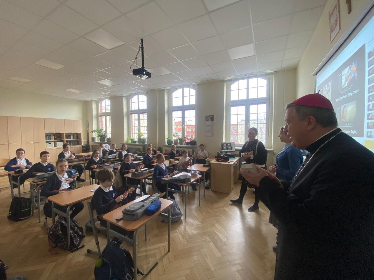 Arcybiskup i prezydent odwiedzili przedszkolaków podczas lekcji plastyki, a uczniów szkoły podstawowej podczas lekcji muzyki. Nie zabrakło wspólnego kolędowania.