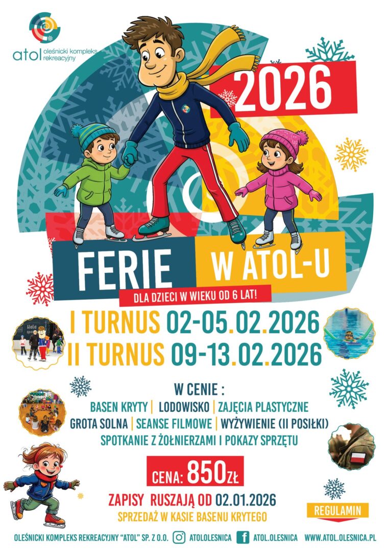 ATOL Oleśnicki Kompleks Rekreacyjny zaprasza dzieci i młodzież do udziału w półkoloniach zimowych „FERIE W ATOL-u 2026”. To propozycja aktywnego i bezpiecznego spędzenia ferii w Oleśnicy, pełna sportu i zabawy.