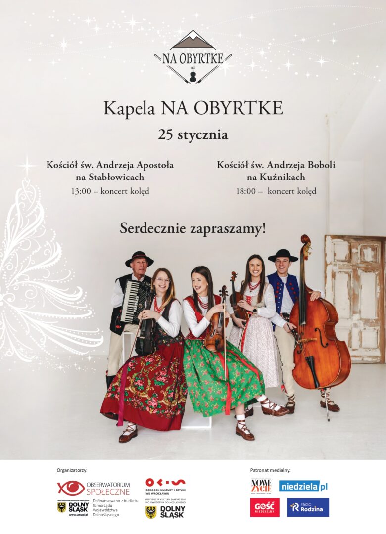 Wyjątkowa muzyczna propozycja dla wszystkich, którzy chcą przedłużyć radość Bożego Narodzenia i wspólnie zanurzyć się w pięknie polskiej tradycji. Fundacja Obserwatorium Społeczne oraz Nowe Życie zapraszają mieszkańców Wrocławia na noworoczne kolędowanie z udziałem kapeli „Na Obyrtke”.