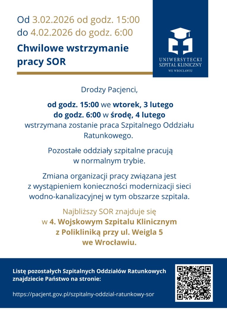 Uniwersytecki Szpital Kliniczny we Wrocławiu informuje, że Szpitalny Oddział Ratunkowy (SOR) będzie czasowo nieczynny od wtorku, 3 lutego, godz. 15:00 do środy, 4 lutego, godz. 6:00.