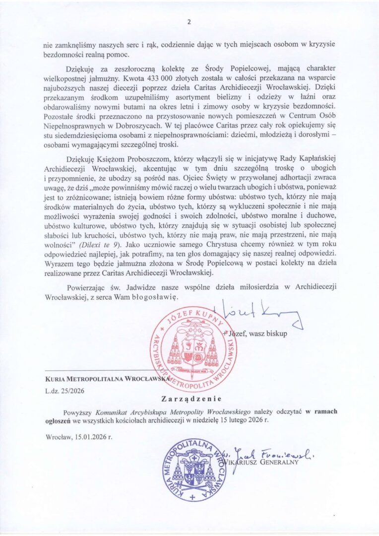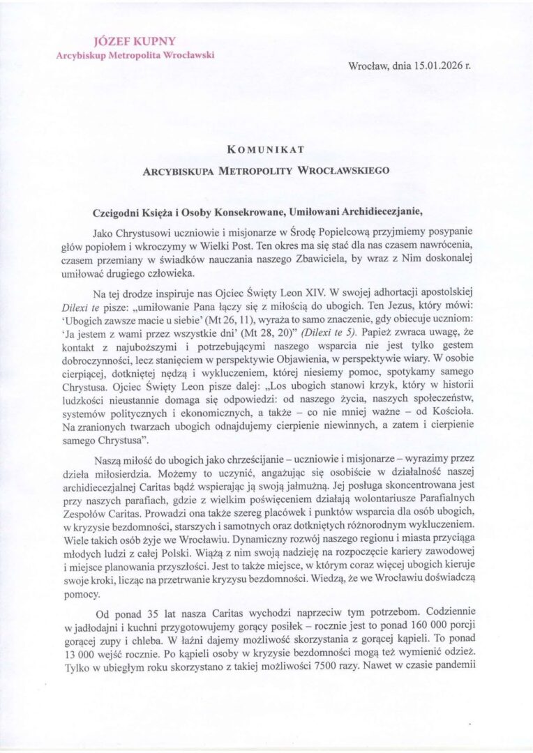 Fot. Komunikat Metropolity Wrocławskiego na Środę Popielcową