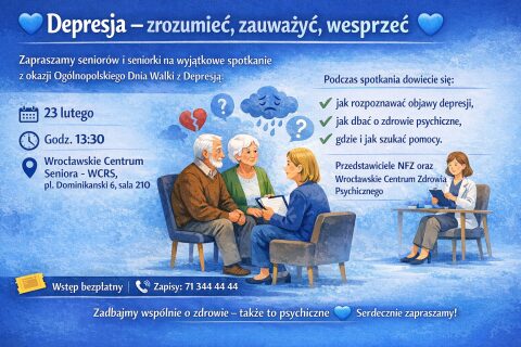 Wrocławskie Centrum Rozwoju Społecznego, Centrum Zdrowia Psychicznego oraz Narodowy Fundusz Zdrowia zapraszają osoby w wieku senioralnym na bezpłatne spotkanie z ekspertami w ramach Światowego Dnia Walki z Depresją, który przypada 23 lutego.