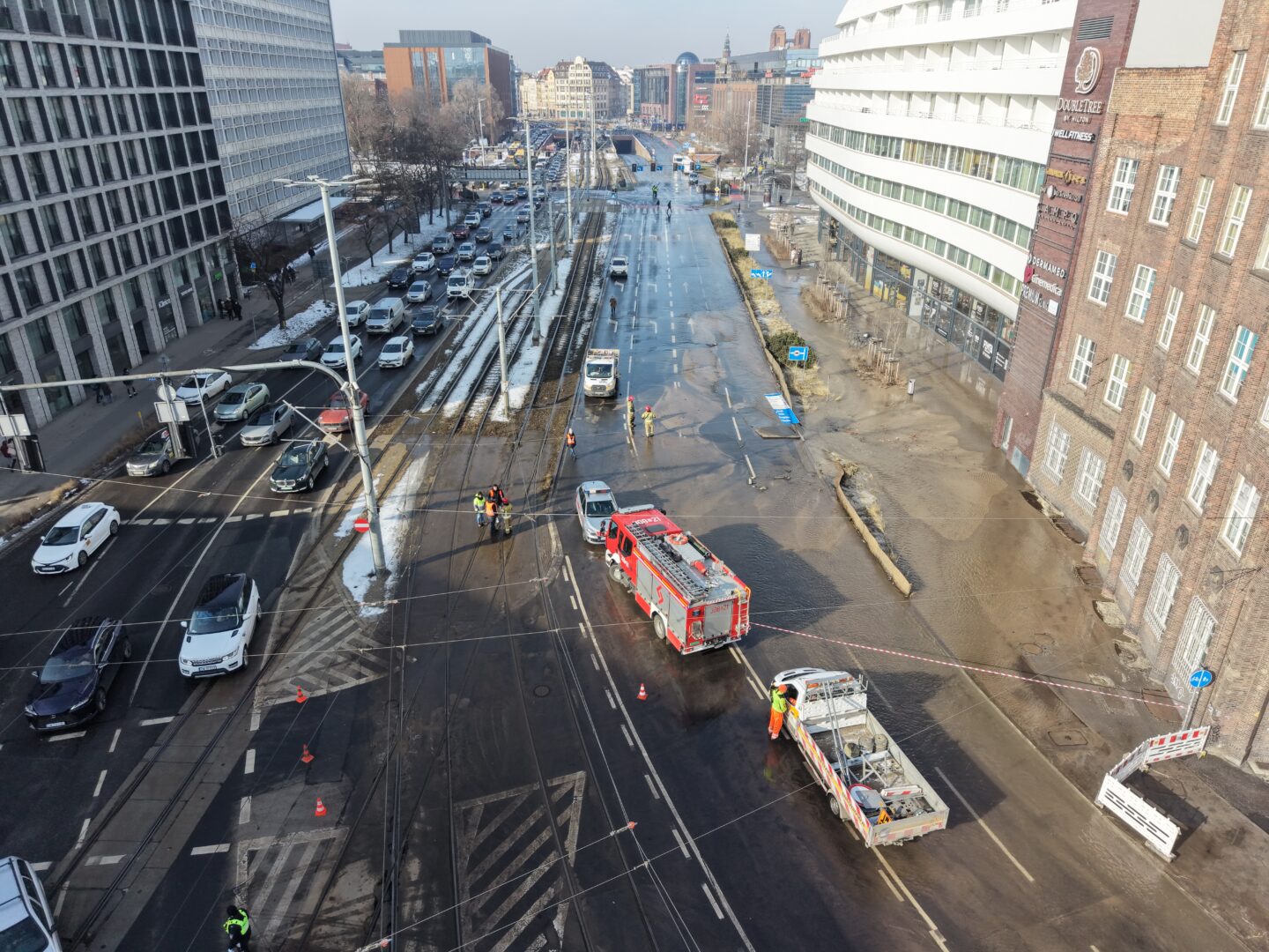 – Na miejscu awarii od samego początku pracuje ponad 20 pracowników MPWiK – zarówno brygady wodociągowe, jak i rozkopowe. Będziemy działać całą noc bez przerwy, aby jak najszybciej udrożnić dwa pasy ruchu na wysokości budynku OVO. Po wykonaniu tymczasowego odtworzenia nawierzchni z płyt betonowych przejazd będzie możliwy najwcześniej po porannym szczycie komunikacyjnym w piątek, 20 lutego 2026 r. – mówi Przemysław Gałecki, wiceprezes MPWiK we Wrocławiu.