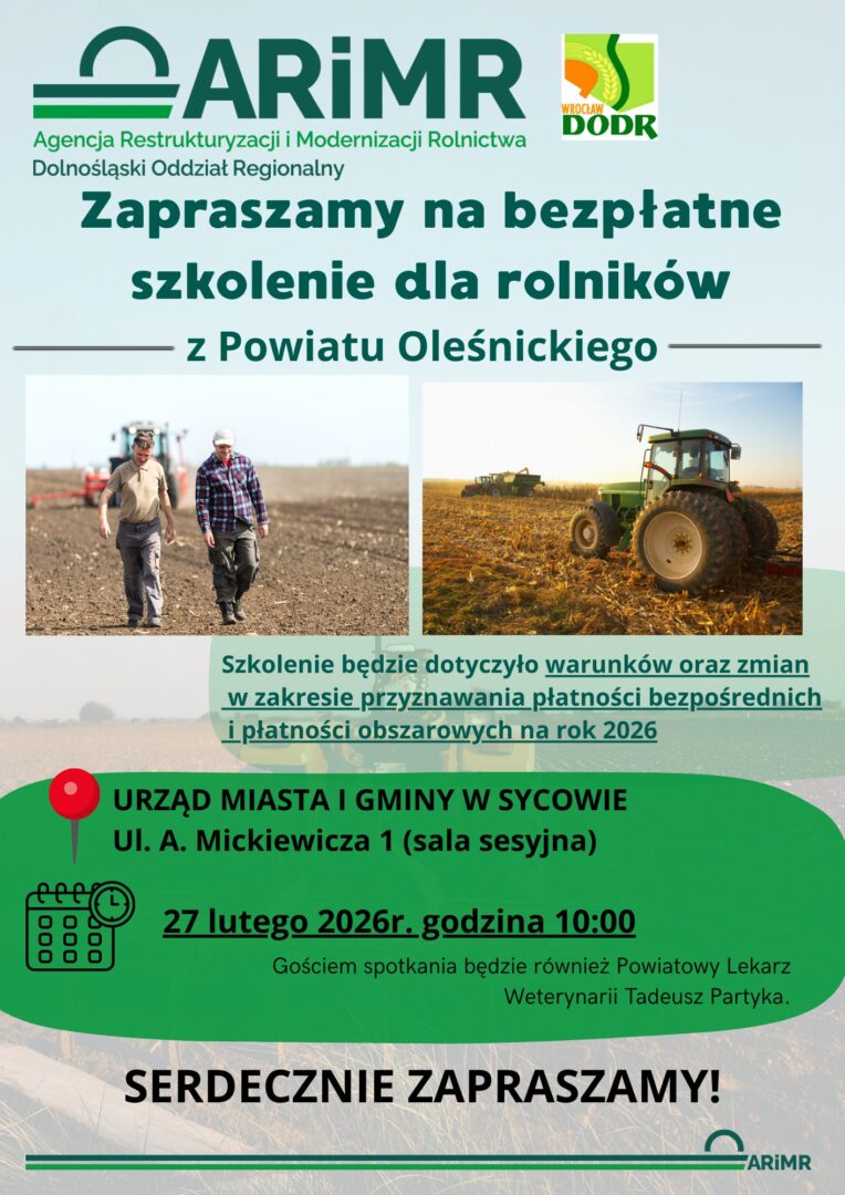 Agencja Restrukturyzacji i Modernizacji Rolnictwa Biuro Powiatowe w Sycowie wraz z Ośrodkiem Doradztwa Rolniczego w Oleśnicy serdecznie zapraszają rolników z powiatu oleśnickiego na szkolenie informacyjne dotyczące warunków oraz zmian w przyznawaniu płatności bezpośrednich i płatności obszarowych na rok 2026.