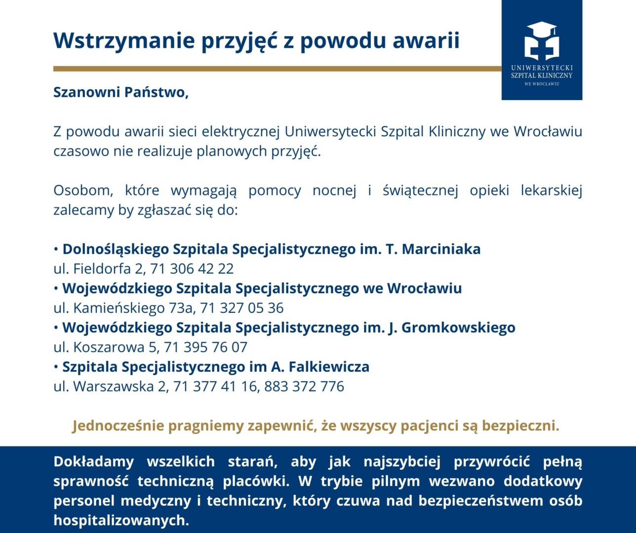 Z powodu awarii sieci elektrycznej Uniwersytecki Szpital Kliniczny we Wrocławiu czasowo wstrzymuje planowe przyjęcia