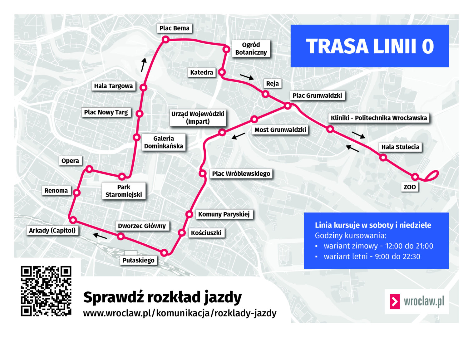 Od 1 maja w wakacyjnym wariancie – czyli w godzinach 9-22:30 – pojedzie linia 0. To linia jeżdżąca w soboty i niedziele, która łączy ważne wrocławskie obiekty publiczne i atrakcje. W związku z trwającą przebudową na Dubois/Drobnera jedzie inną trasą: