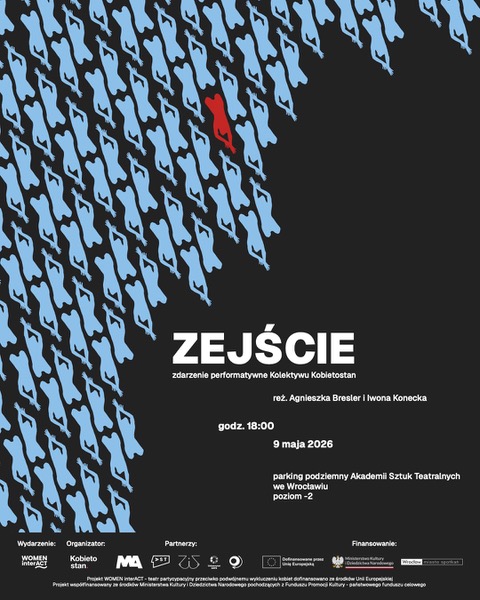 „ZEJŚCIE” to zdarzenie performatywne na dwanaście kobiet i tłum, realizowane w ramach międzynarodowego projektu WOMEN interACT. Spektakl został wspólnie wyreżyserowany przez Agnieszkę Bresler i Iwonę Konecką, a jego ostateczny kształt powstał w toku czteromiesięcznej pracy warsztatowej – wspólnych rozmów, improwizacji, działań performatywnych oraz praktyk kreatywnego pisania.