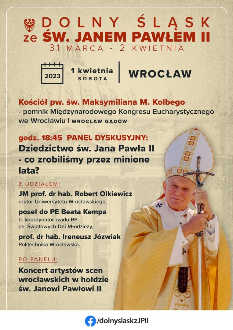 Jednym z wydarzeń w ramach obchodów z okazji 18 rocznicy śmierci Jana Pawła II jest panel dyskusyjny 2 kwietnia w kościele pw. św. Maksymiliana M. Kolbego we Wrocławiu. Wydarzenie organizowane jest pod tytułem „Dziedzictwo św. Jana Pawła II – co zrobiliśmy przez minione lata?” W spotkaniu będzie uczestniczyć Poranny Gość Radia Rodzina Beata Kempa, europoseł z Solidarnej Polski. Rozmawialiśmy o weekendowych wydarzeniach, o zaangażowaniu młodych ludzi, dla których papież Polak jest nadal bliski.