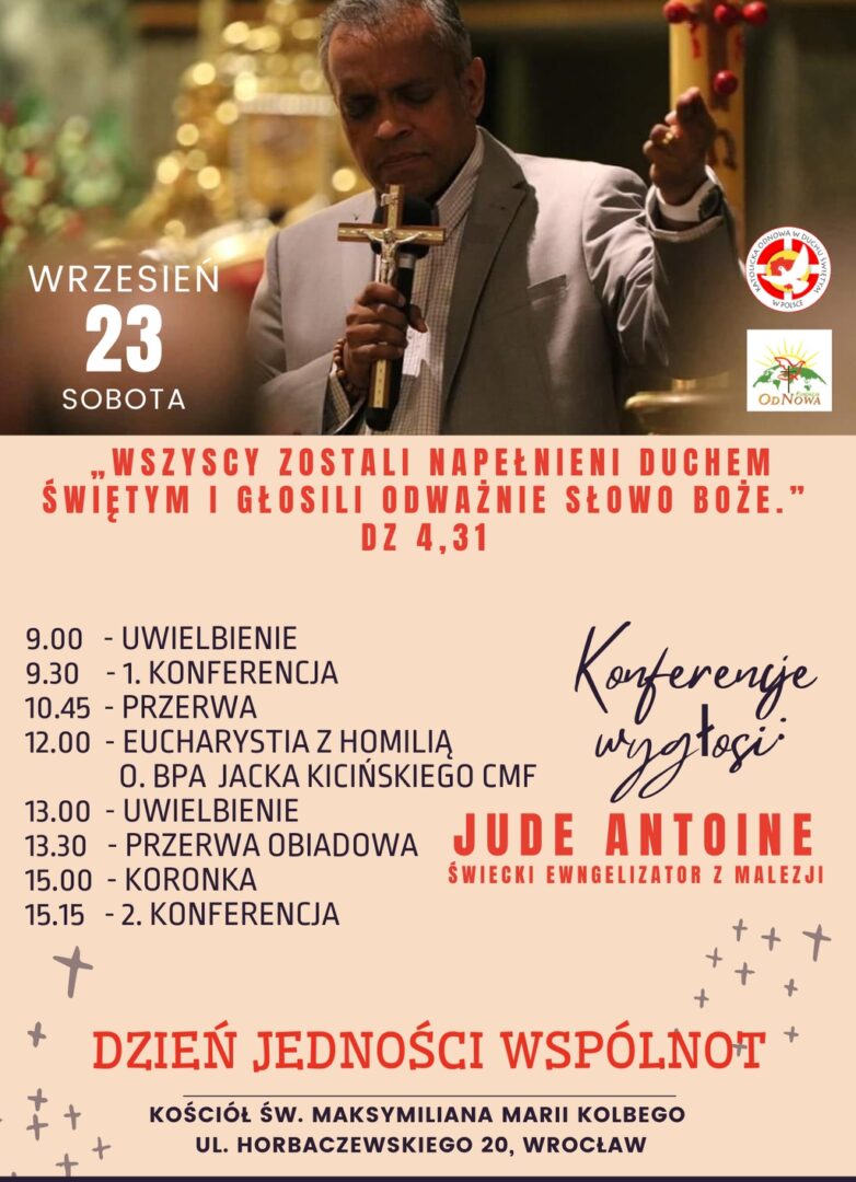 Dzień Jedności odbędzie się w Parafii pw. św. Maksymiliana Marii Kolbego (ul. Horbaczewskiego 20) we Wrocławiu. Rozpocznie go wieczorna Eucharystia, po której Jude wygłosi nauczanie. Jest to spotkanie dla kapłanów, liderów i animatorów wspólnot.