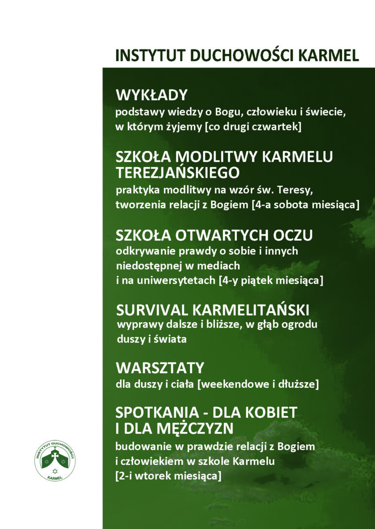 Oprócz cyklu wykładów i szkoły modlitwy IDK proponuje kontynuację spotkań dla kobiet (każdy drugi wtorek miesiąca), szkołę otwartych oczu (czwarty piątek miesiąca) i survivale karmelitańskie. Najbliższy już 27-29 października w Marianówce. Zapisy przez idk.wroclaw@gmail.com