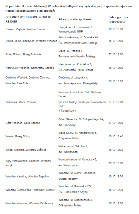 Ks. Tomasz Kowalski z Sekretariatu Synodu Archidiecezji Wrocławskiej zaprasza na rejonowe spotkania synodalne (czyli takie, które gromadzą po kilka dekanatów). Wydarzenie już 16 października w wielu parafiach. Są także inne terminy. Szczegóły na https://synodwroclaw.pl/.