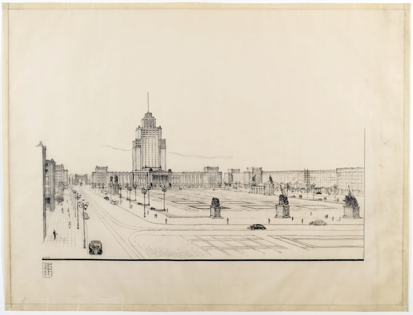 Powyżej: Niezrealizowany projekt konkursowy zabudowy Osi Placu Grunwaldzkiego, autor arch. Teodor Teodorowicz-Todorowski, 1951 (źródło: Muzeum Architektury we Wrocławiu).