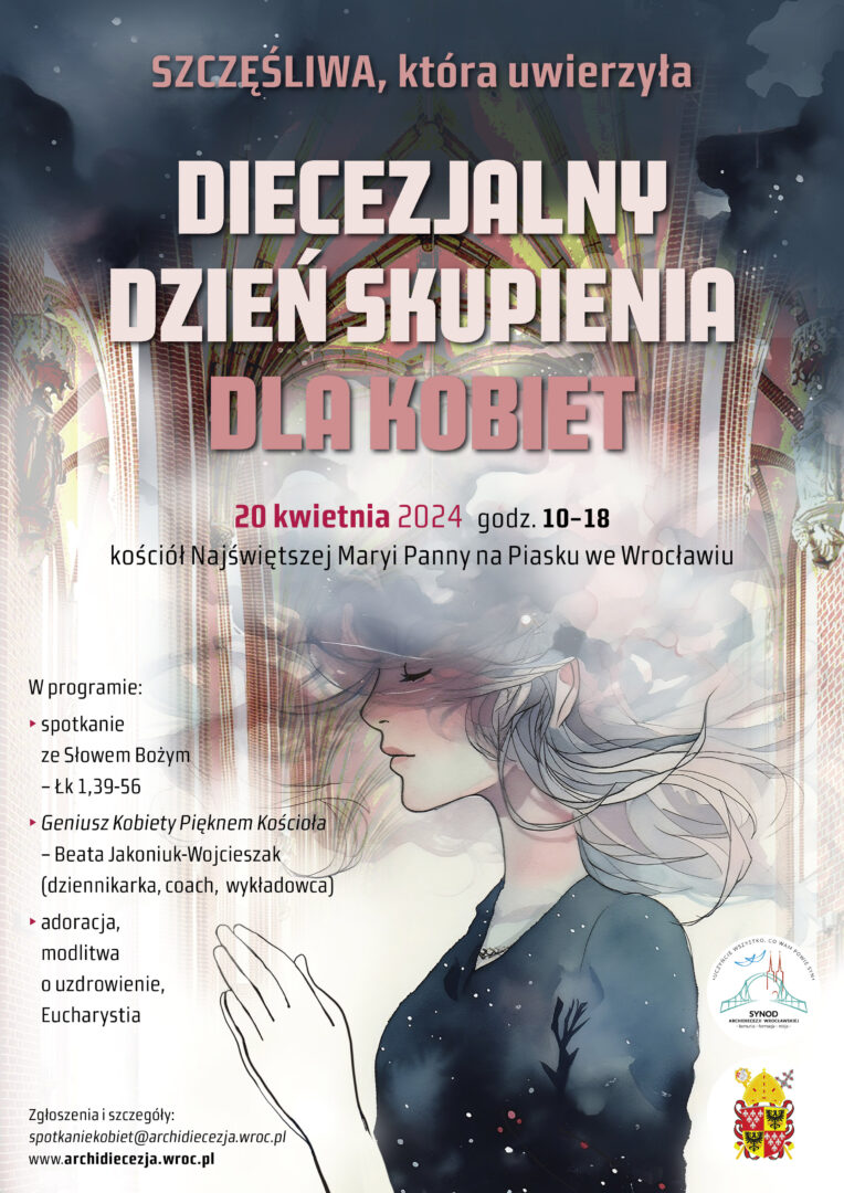 20 kwietnia 2024 r. w Kościele NMP na Piasku we Wrocławiu odbędzie się dzień skupienia dla kobiet każdego stanu i wieku z całej archidiecezji wrocławskiej. W programie medytacja ze Słowem Bożym, konferencja o geniuszu kobiet, agapa oraz Msza św. pod przewodnictwem Abp Józefa Kupnego.