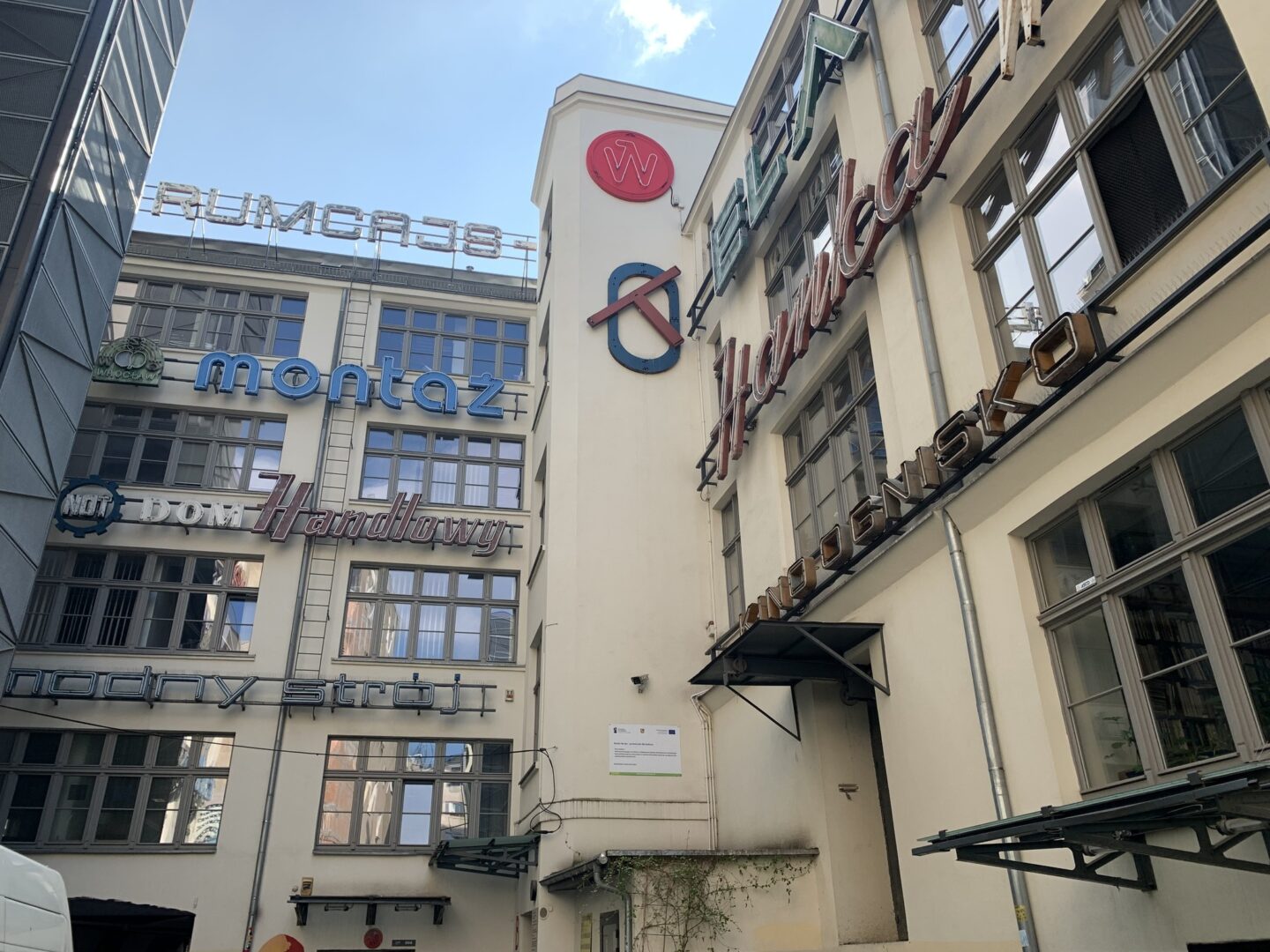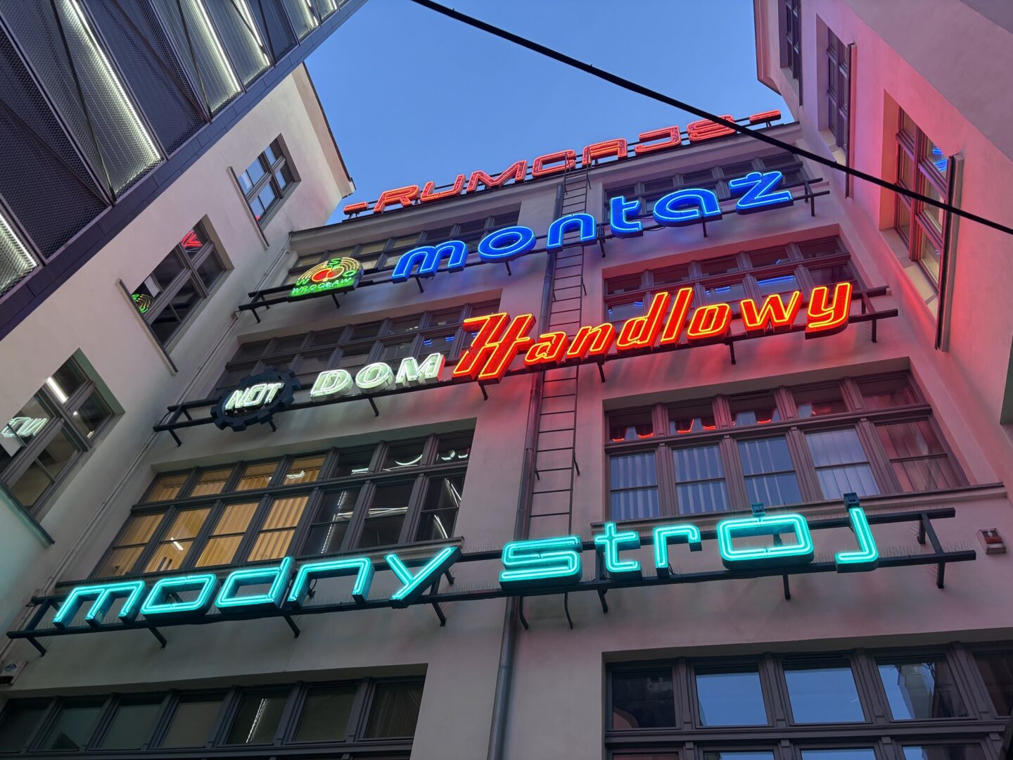 Znajdziemy tu około 30 neonów zdemontowanych kiedyś ze sklepów, kin i innych budynków, takich jak NOT, Kino Warszawa, Cuprum czy Elam. Z czasem zaczęły niszczeć, na podwórku świeciły tylko niektóre napisy. Po długich rozmowach właściciel neonów podpisał umowę z miastem, które sfinansowało ich naprawę.