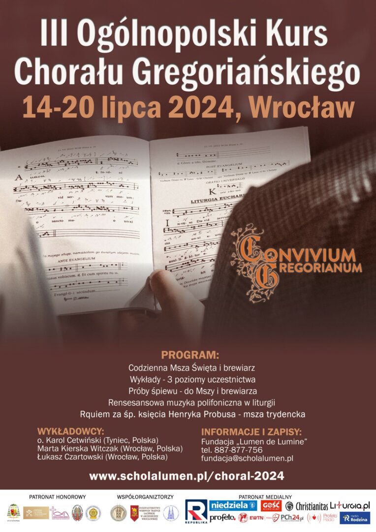 Fundacja Lumen de Lumine zaprasza muzyków, organistów, kantorów, osoby zainteresowane chorałem gregoriańskim i polifonią do udziału w ogólnopolskim kursie. Odbędzie się on w dniach 14-20 lipca 2024 r. w na Ostrowie Tumskim we Wrocławiu.
