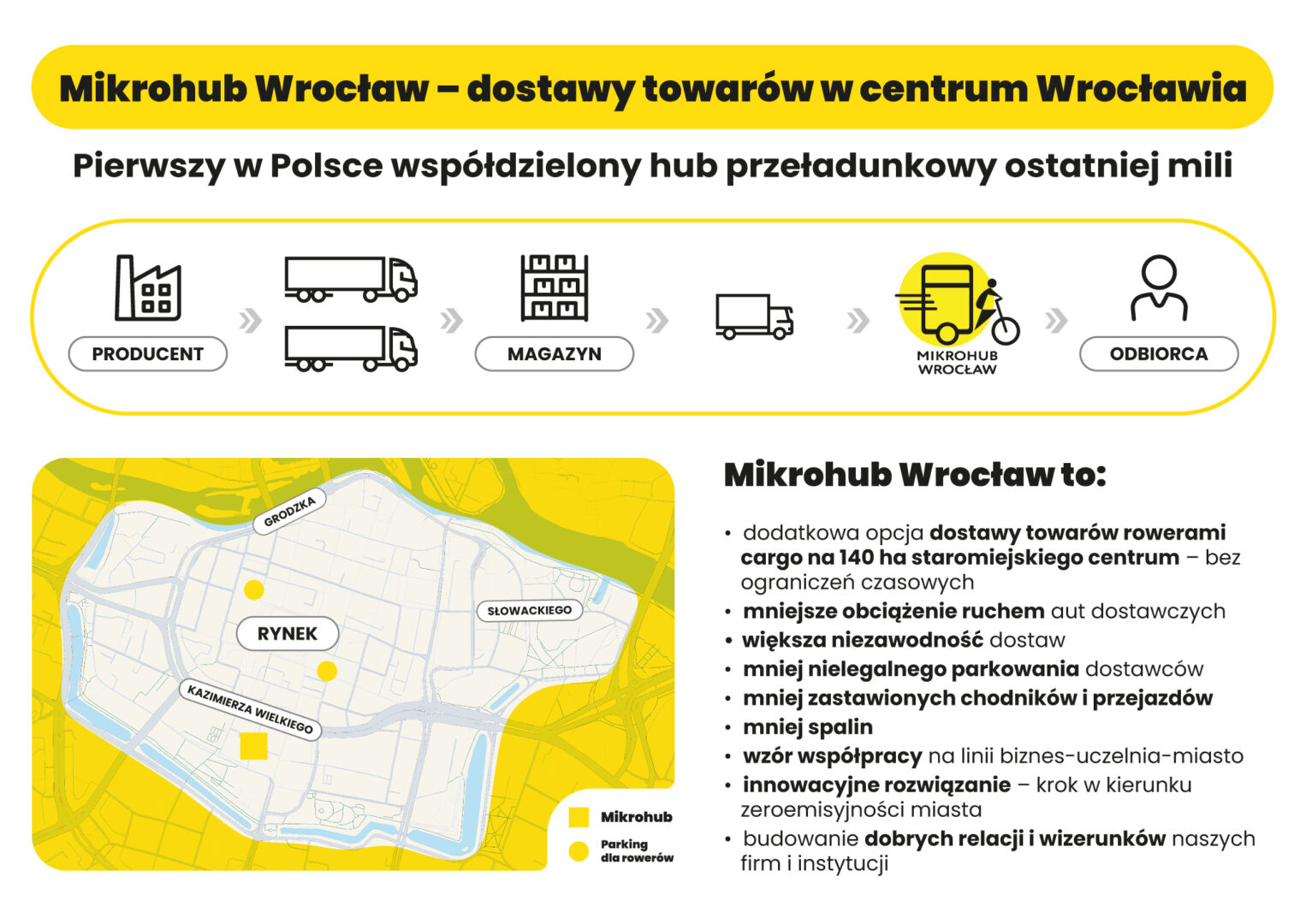 Miasto Wrocław wspólnie z Uniwersytetem Ekonomicznym we Wrocławiu, firmami kurierskimi, dystrybutorem żywności, a także przy udziale administratora parkingu pod NFM otwiera pierwszy w Polsce współdzielony mikrohub przeładunkowy w centrum.