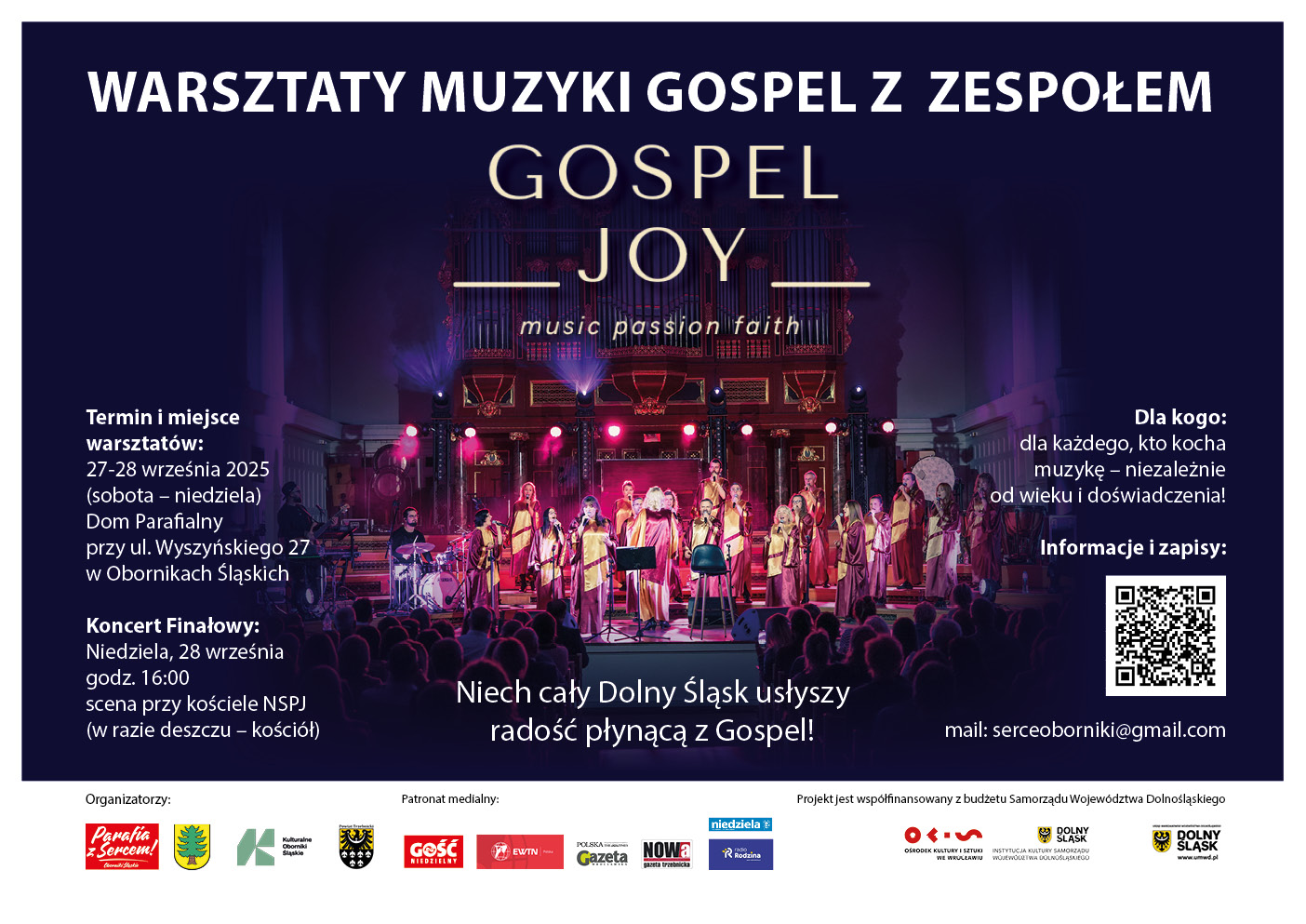 Parafia pw. Najświętszego Serca Pana Jezusa w Obornikach Śląskich zaprasza mieszkańców miasta i gminy na warsztaty muzyki Gospel i Koncert Finałowy, które odbędą się 27-28 września. Trwają zapisy.