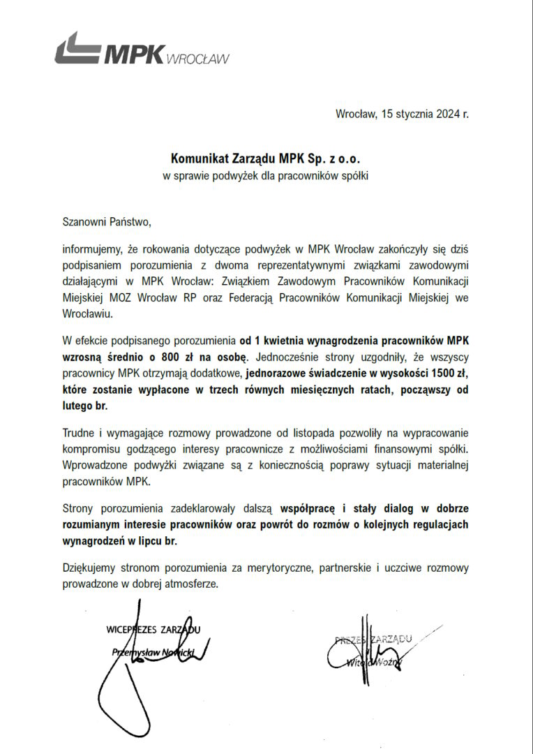 Związki zawodowe działające w MPK Wrocław podpisały porozumienie z zarządem spółki ws. podwyżki płac. Od 1 kwietnia wynagrodzenia pracowników MPK wzrosną średnio o 800 zł na osobę. Jedna z organizacji związkowych – MOZ NSZZ Solidarność nie podpisała porozumienia, tłumacząc, że „propozycje i warunki podniesienia wynagrodzeń pracownikom MPK Wrocław są nie do zaakceptowania”.