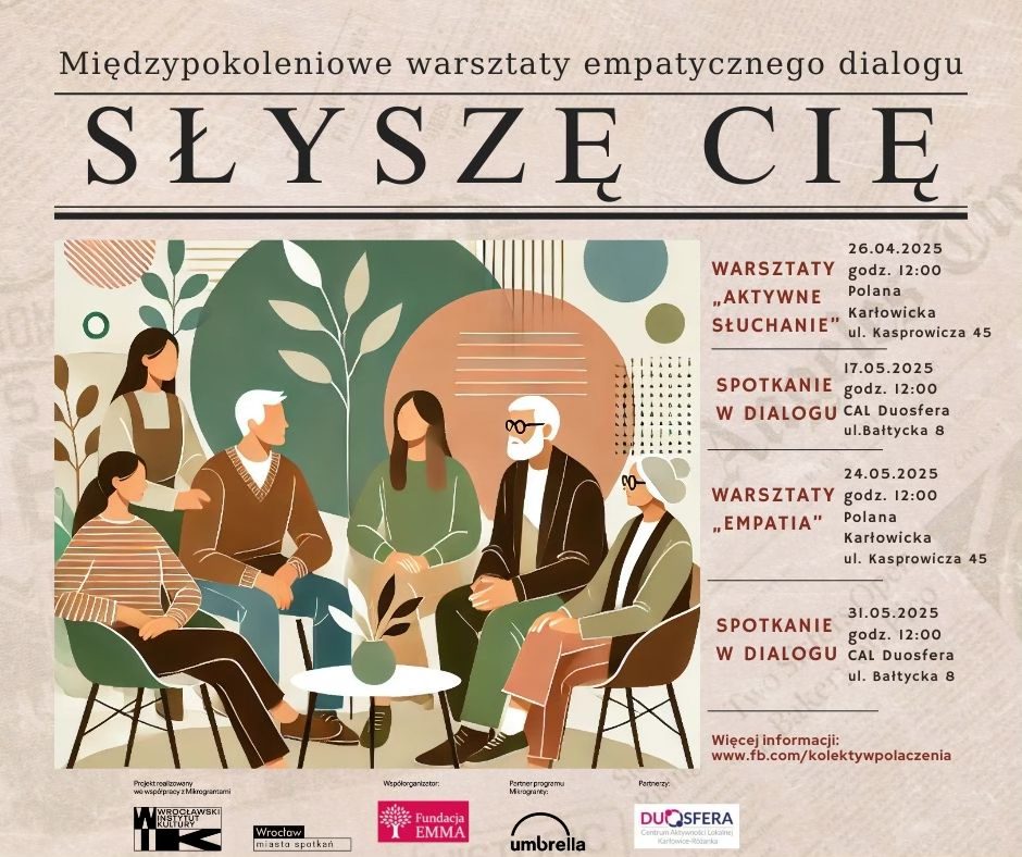 W majowe soboty na Polanie Karłowickiej przy al. Kasprowicza oraz w CAL-u Duosfera przy ul. Bałtyckiej we Wrocławiu odbywają się spotkania oraz warsztaty w ramach projektu „Słyszę Cię”. Działanie uzyskało wsparcie Wrocławskiego Instytutu Kultury i realizowane jest jako mikrogrant.