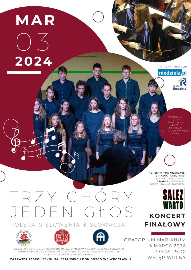 „Trzy chóry, jeden głos” – to nazwa projektu edukacyjnego realizowanego przez katolickie szkoły średnie z Polski, Słowacji i Słowenii. Polskę reprezentują uczniowie z Liceum Salezjańskiego we Wrocławiu. Celem inicjatywy jest zawiązanie relacji, wymiana doświadczeń oraz współtworzenie kultury. Projekt zakłada cykliczne występy młodzieży, co roku w innym kraju partnerskim.