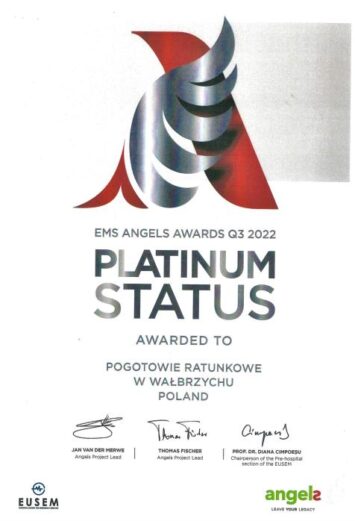 Pogotowie Ratunkowe w Wałbrzychu zostało wyróżnione Platynową Nagrodą Programu „Inicjatywa ANGELS”. Inicjatywa Angels honoruje szpitale i pogotowia ratunkowe przystosowane do szybkiego i profesjonalnego postępowania w przypadku wystąpienia udaru mózgu. Program jest aprobowany przez Europejską Organizację Udaru Mózgu oraz Światową Organizację Udaru Mózgu.